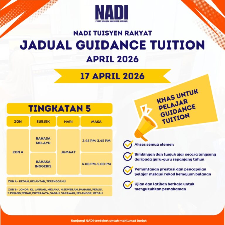 📢 GUIDANCE TUITION APRIL 2026: TINGKATAN 5 📢 Untuk pelajar Guidance Tuition Tingkatan 5, teruskan momentum pembelajaran anda dengan menyertai kelas bimbingan berfokus! Sila rujuk lampiran jadual untuk sesi pada 17 April 2026: 📍 ZON A (Kedah, Kelantan, Terengganu)📚 Subjek: […]