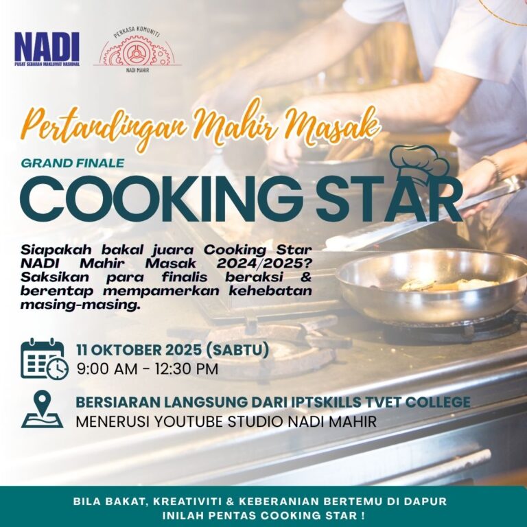 🧑🏻🍳 AYUH SAKSIKAN SIAPAKAH JUARA SEBENAR DI DAPUR! 🔥👑 Pertandingan Cooking Star kini tiba ke peringkat akhir! Saksikan peserta terbaik beraksi secara LIVE dari IPTSKILLS TVET COLLEGE menerusi youtube Studio NADI Mahir ! 🎥👩🏻🍳 📅 Tarikh: 11 Oktober 2025 (Sabtu)⏰ […]