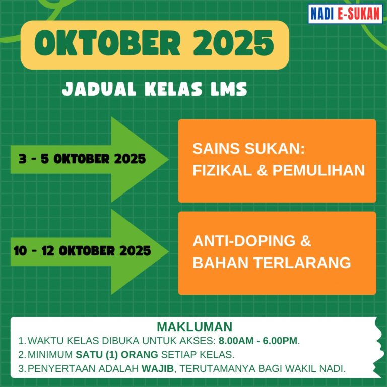 📢 Makluman Kelas Bulan Oktober di LMS NADI E-Sukan Dimaklumkan bahawa kelas-kelas bagi bulan Oktober 2025 akan dijalankan seperti berikut: 1️⃣ Sains Sukan: Fizikal & Pemulihan📅 Tarikh: 3 – 5 Oktober 2025 2️⃣ Anti Doping dan Bahan Terlarang📅 Tarikh: 10 […]