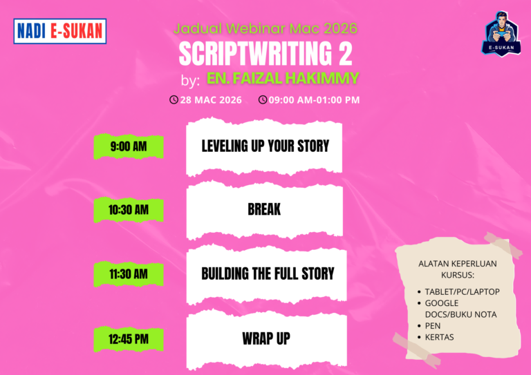 PROGRAM WEBINAR SCRIPTWRITING 2 🗓 Tarikh: Sabtu, 28 Mac 2026  🕘 Masa: 9:00 pagi – 1:00 tengah hari  📍 Lokasi: Google Meet